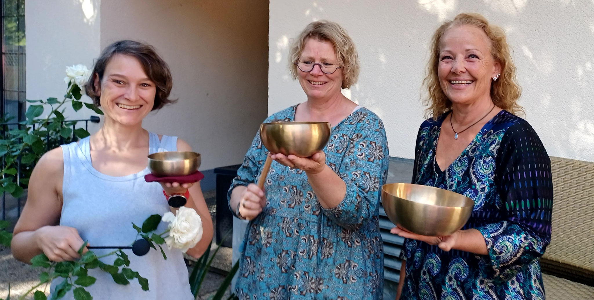 Hospizteams, die auch Vereinsmitglieder sind, bei der Teilnahme an speziellen Klangschalen-Kursen im Herbst 2023, "Klangschalen in der Pflege, Demenz und Palliativbegleitung" an