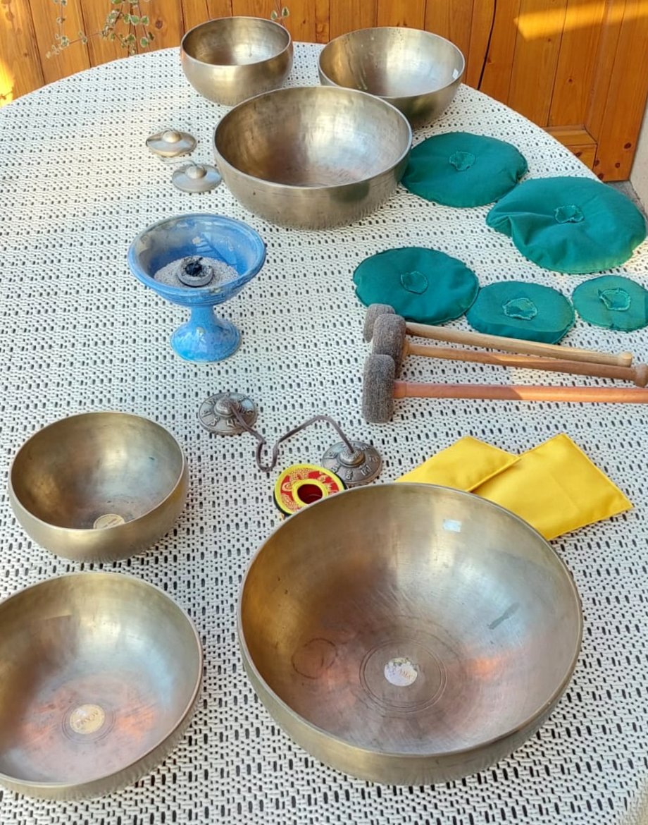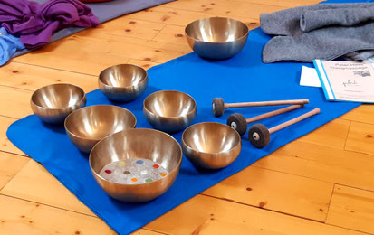 Schlegel und Klangkissen sowie Fachliteratur. Notiz am Rande: Ein qualitativ hochwertiges Set aus 3 Schalen kostet ca. EUR 800,- , ohne Zubehör!